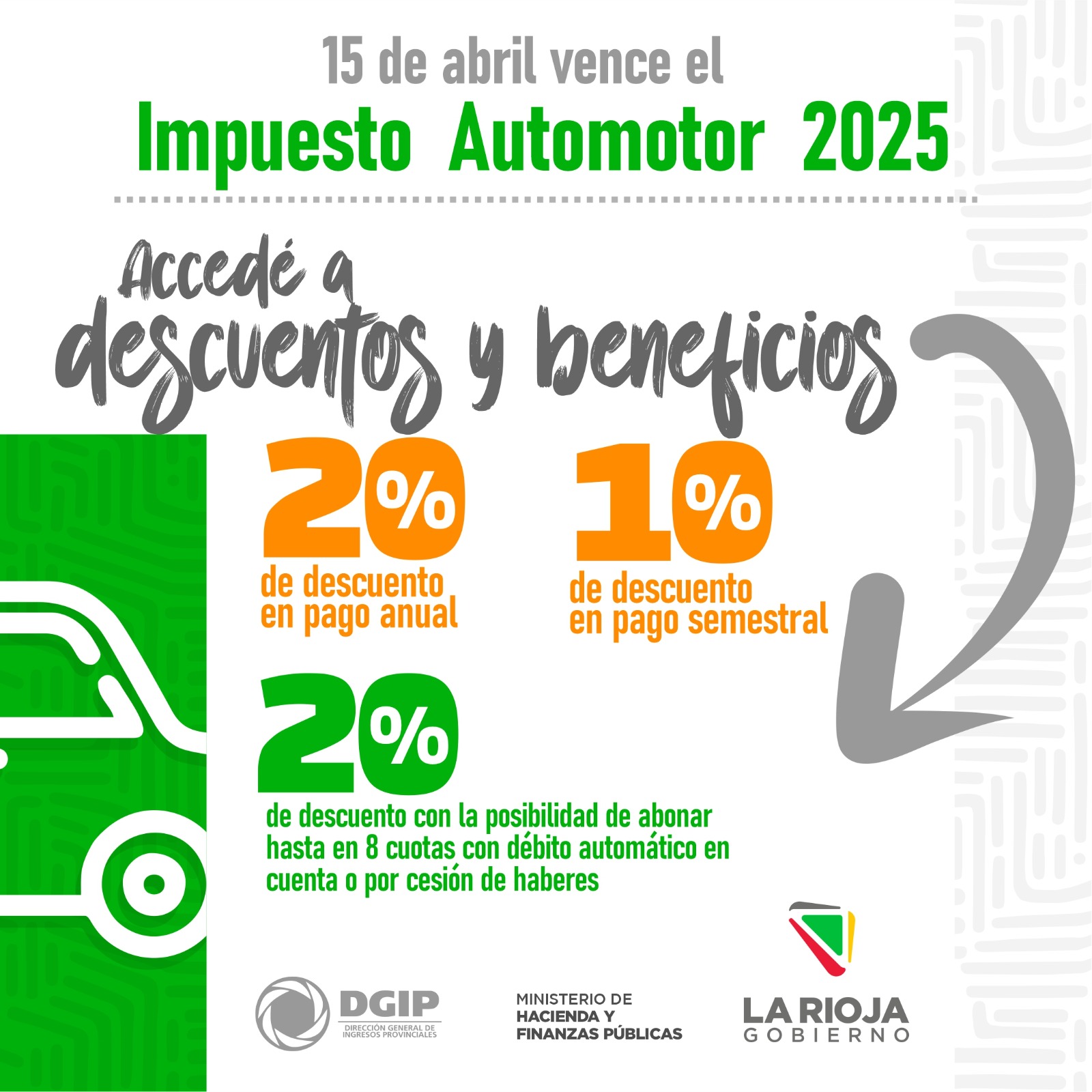El Ministerio de Hacienda y Finanzas Públicas, a través de la Dirección General de Impuestos Provinciales (DGIP), informó las fechas de vencimiento para el pago del Impuesto Automotor e Inmobiliario 2025. El Impuesto inmobiliario vencerá el 25 de marzo, mientras que el impuesto automotor tendrá su vencimiento el 15 de abril.