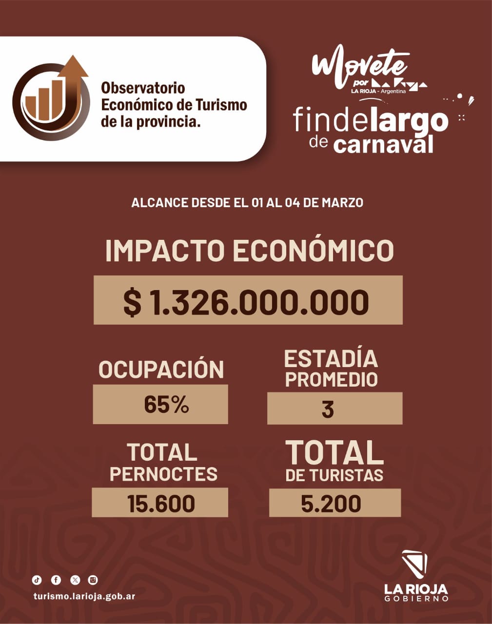 Según datos emitidos por el Observatorio Económico de Turismo de La Rioja, la provincia marcó un 65% de ocupación hotelera, con 15.600 pernoctes y una estadía promedio de tres días dejando como resultado un impacto económico de más de 1.326.000.000 pesos que quedan netamente en el sector turístico.