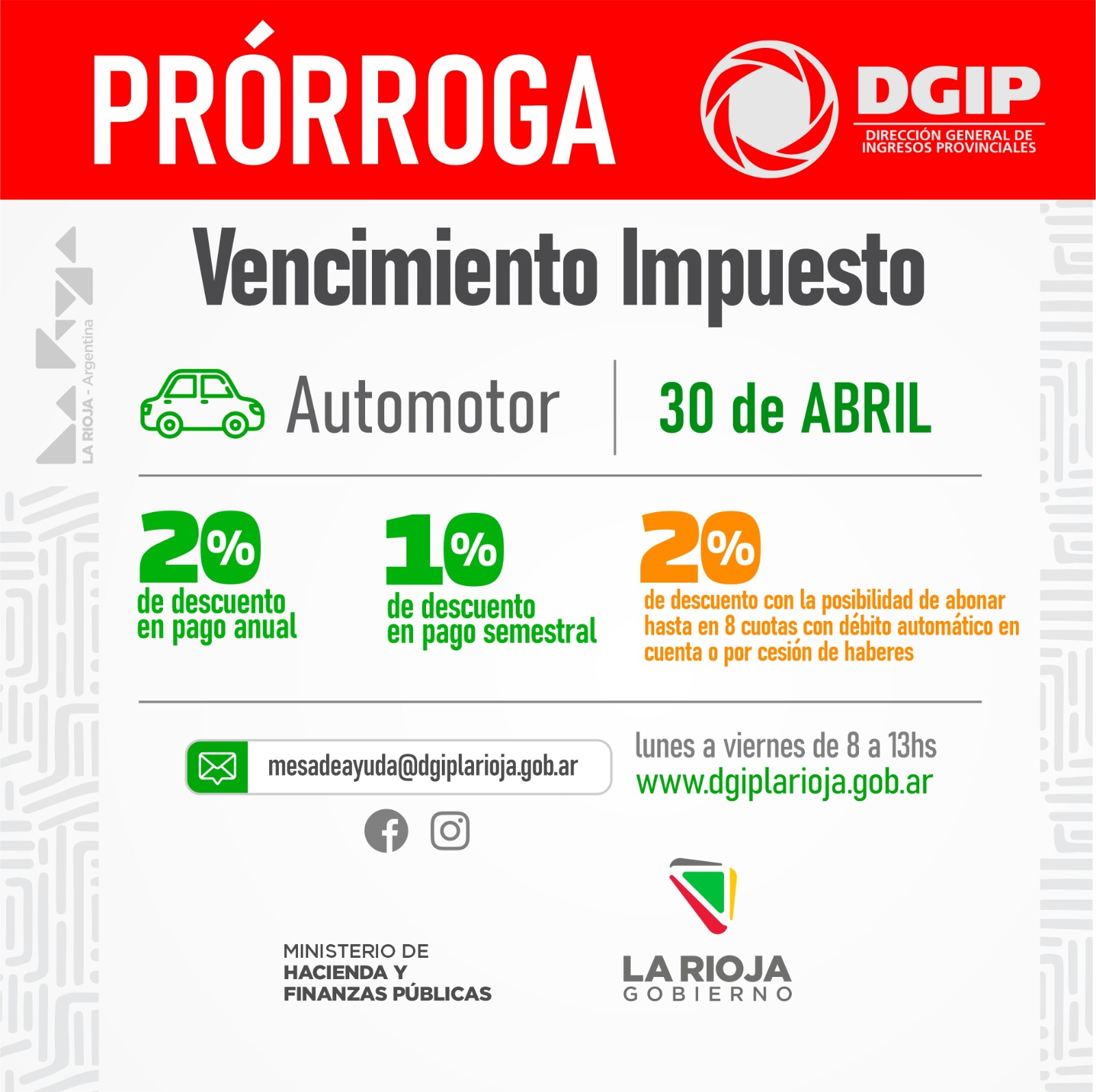 Para más información o asesoramiento, se puede contactar a la Mesa de Ayuda al correo electrónico: mesadeayuda@dgiplarioja.gob.ar o llamar a la línea gratuita 0800-888-3447.